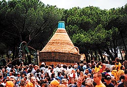 The uniquely beautiful countryside all around Impruneta has captured the interest of hiking enthusiasts; an interesting walk (about 5 km long), though possible with any form of transport, starts just outside the town on the Pozzolatico road; from here take a steep country road for Monte dei Meccoli, Tesserata, Quintole, Baruffi and Le R.ose. "All sorts of games could be played in the farmyard and barns of my childhood. We had to make do with simple pleasures and so, on summer evenings, my friends and I would often lie down in the soft grass and just count the stars, delighting in the beauty of the sky. In June and July we used to spend a lot of time trying to catch glow worms because, according to an old legend, if we managed to place one under a turned-up glass, we would one day be rich. My parents would often give me one, perhaps to help me hold onto this magic illusion". Many important cultural events, together with several other interesting initiatives, are organized at Impruneta throughout the year and manage to maintain the local traditions whilst also exploiting its tourist potential; these have made the town such an important tourist attraction that it is now well known both in Tuscany and abroad. The most important of these events are: the Fair of St. Luke (Patron Saint of the town) and the Grape Harvest Festival. The former, originally a cattle market that developed thanks to the geographical position of the town, is held every year in mid October and centred around the cattle and horse market and other sports and cultural events. The second is a September rite to Bacchus and the grape, consacrated by a colourful procession of allegorical floats created by the four competing quarters of the town: S. Antonio, Pallò, Sante Marie and Fornaci. These and other events are part of the "Tra Toscanità e Associazione" programme that the Impruneta town council is organizing in collaboration with the various Associations that have grown up in the area. The 1999 programme stands out for its high artistic and cultural content and will include a clever combination of traditional appointments and new cultural experiences, some of which were held in May and June, like the Festival of Spring and the Tour of the 7 Churches, musical and theatrical performances in the Impruneta churches. The New Impruneta Summer Season organized by the Sali al Pozzo Committee will continue until September, with open-air cinema, performances and gastronomic events. Last, but not least, the Christmas fair will be enlarged and also include the "1st Impruneta Cotto Design Competition". Naturally many events are held in the splendid setting of Piazza Buondelmonti. "The square was important as it was a sort of information centre where people could meet and exchange news; passing pedlers who sold almost anything, 'from needles to cannons', were another source of news. I remember a chap called Mosca from San Casciano who used to do his rounds on Saturdays on his bicycle, slung around with wooden crates to hold shoe polish, laces, etc. When he arrived with his wares he always told us about something he had seen elsewhere. Then there was Ceccherini who sold razor blades from a little truck and turned all his news into jokes, thus amusing the people who curiously crowded around him. This is why I can never forget my love of this town or tire of praising its virtues. As far as I am concerned Impruneta will always be the most beautiful place in the world".